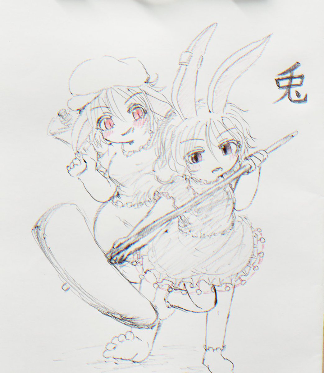 「お祝い」 #毎月17日と18日はイナバの日 ということで、うどんげとてゐを描いてみました。 清蘭が自機に昇格したということで、みんなが喜んでるとこです。今回は便乗です #鈴仙・優曇華院・イナバ #因幡てゐ #清蘭 #鈴瑚 #東方project #透明水彩 #watercolor #水彩 #アナログ