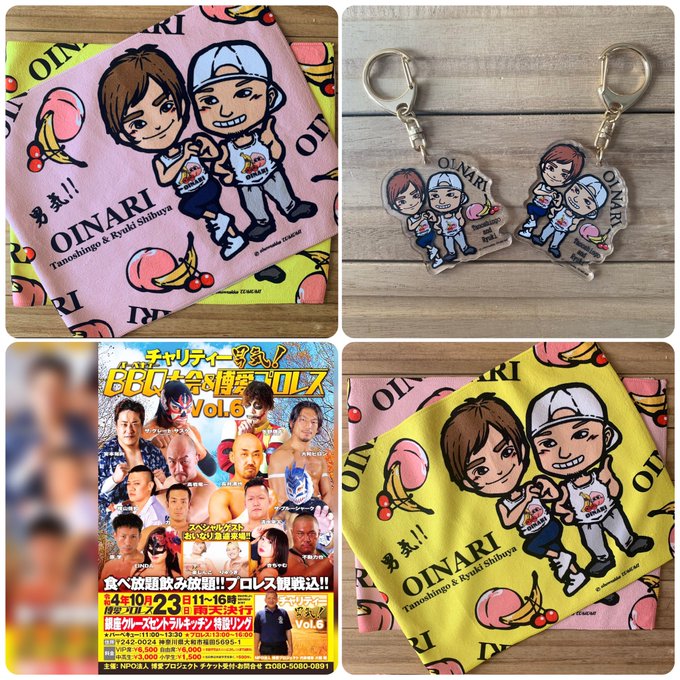 ゲストにおいなりの楽しんごちゃんと渋谷りゅうき君が出演するイベント博愛プロレスBBQ✨ おいなり新作グッズは、ピンクと黄色の大判タオルと、キーホルダー✨ 待ってるね! #楽しんご #渋谷りゅうき #おいなり #博愛プロレス #イラスト #イラスト好きさんと繋がりたい #絵描きさんと繫がりたい