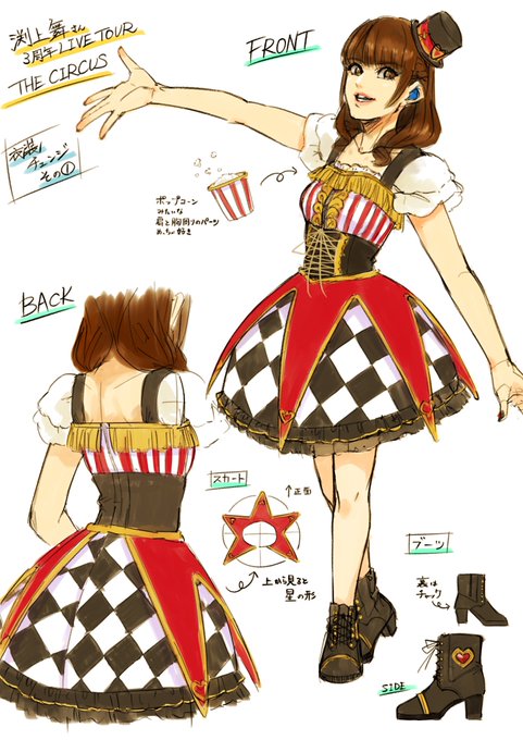 渕上舞さんのTHE CIRCUSお衣装レポ(うろ覚え)🎪 パンフと記憶の情報でしか描いてないので所々間違ってる気がしますが…🙏 とっても綺麗で楽しい公演でした✨ #渕上舞3周年LIVETOUR