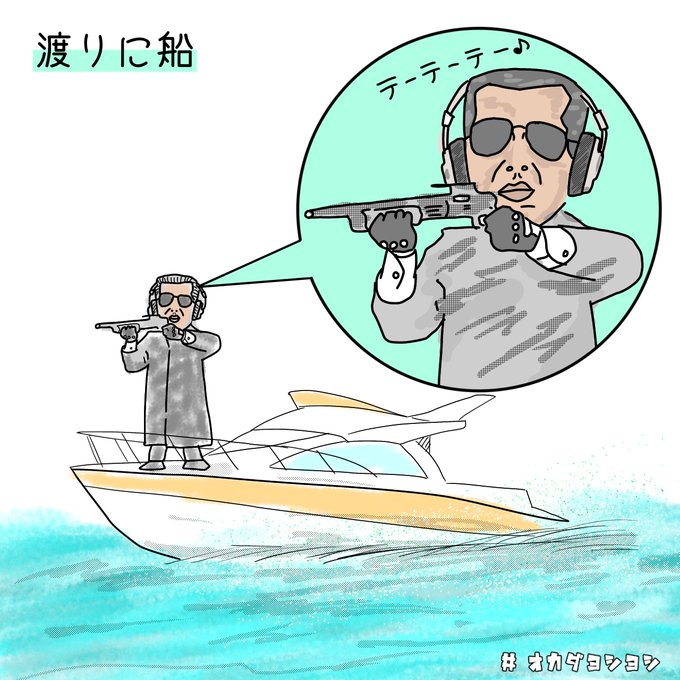 描けました😊‼️ 思いつきシリーズ・ことわざ編 「渡りに船」より 「渡にフネ」 #イラスト #イラスト好きな人と繋がりたい #みんなで楽しむTwitter展覧会 #ダジャレ #渡哲也 #西部警察 #フネ #サザエさん #art #絵描きさんと繫がりたい