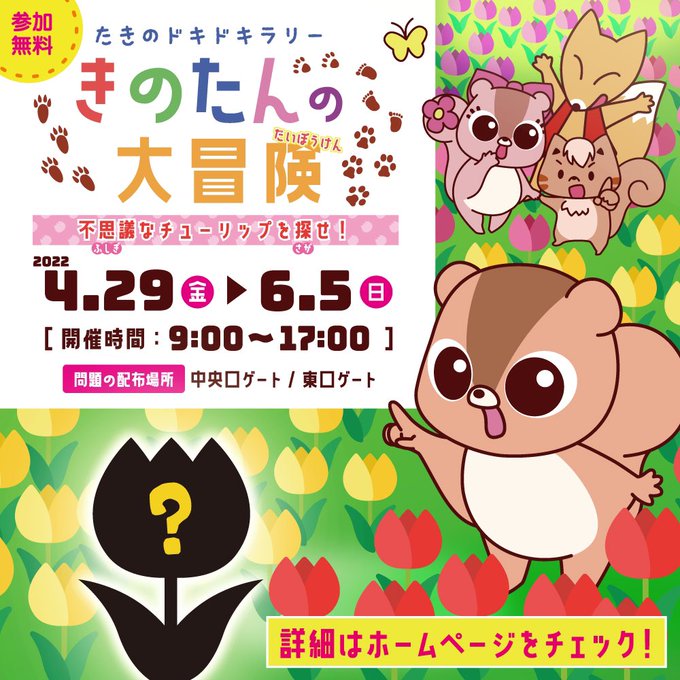 みなさん!GWの予定は決まりましたか?(*’▽’*) 4月29日(金祝)から #滝野すずらん丘陵公園 ( @takino_official )の #謎解き イベント【 #きのたんの大冒険 ~不思議なチューリップを探せ!】が始まる予定です🌷✨ 今回もポスター諸々のイラスト描かせて頂きました❣️詳細はホームページをご覧下さい!