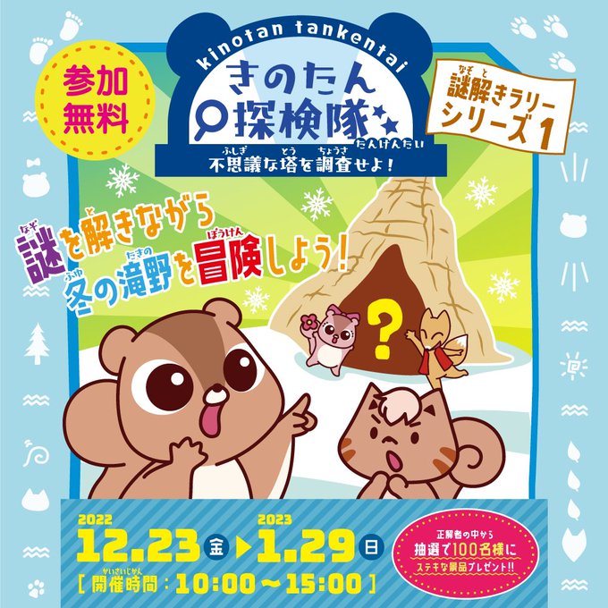 お正月も #滝野すずらん丘陵公園 は元気に開園してます☃️ 私が絵を描かせてもらった #謎解き イベント「きのたん探検隊」🔎お散歩気分でぶらりと遊びに行ってみてください❣️ 冬季は入園無料&イベント参加費も無料です⛄️🌟 #冬休みイベント twitter.com/takino_officia…