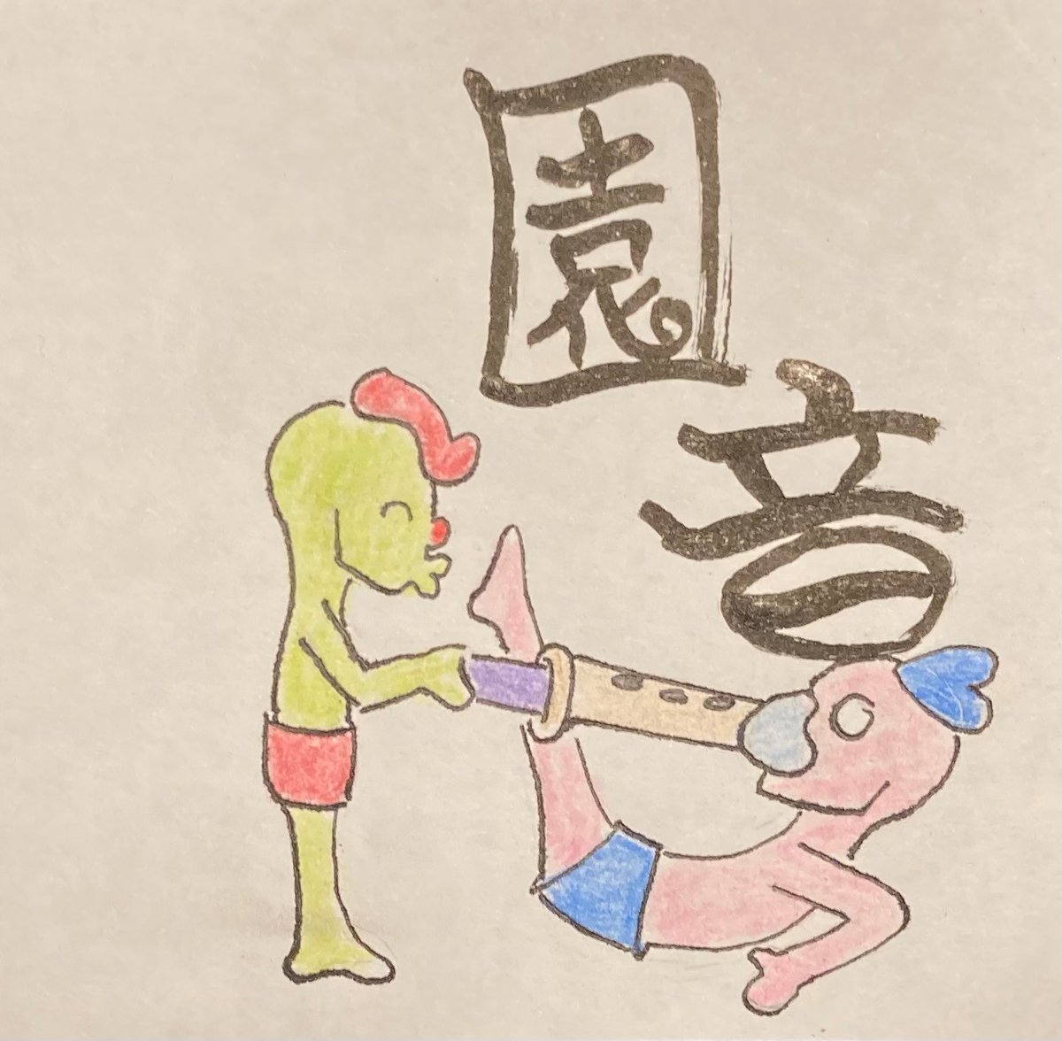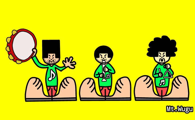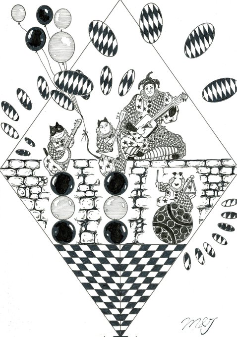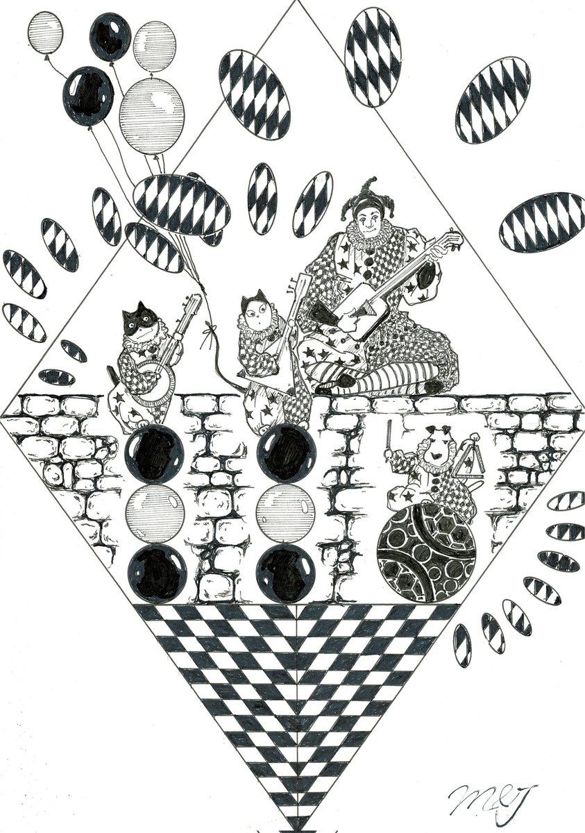 🚦《道化師と陽気な仲間たち》によるストリートパフォーマンス 🎵🎶楽器の演奏🎶🎵 🃏:三味線 😸:バンジョー 😺:バラライカ 🐶:トライアングル #道化師と陽気な仲間たち #アトリエの系譜S #アナログ #picturebookillustration #道化師 #演奏 #マンガスタイルイラスト #ペン画 #路上ライブ