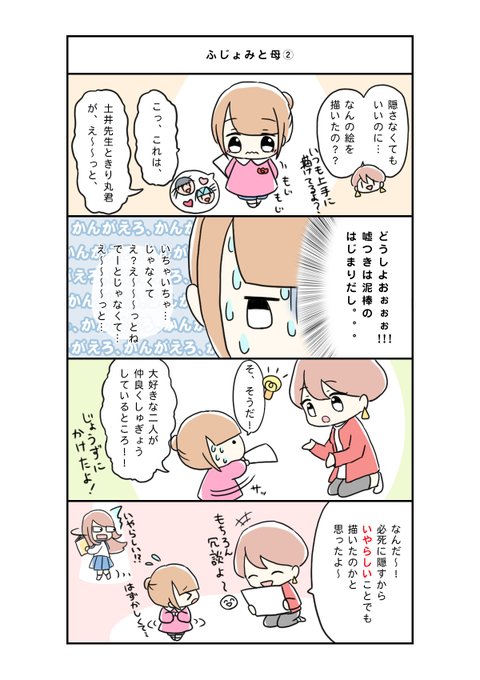 ★第6話「ふじょみと母②」★ 幼稚園で大好きなBLの絵を描いたふじょみちゃん。 でも、BLのことはママに秘密…! ふじょみちゃん、最大のピンチ!? #ぴよっこ腐女子のふじょみちゃん #イラスト #腐女子 #漫画 #マンガ #4コマ漫画 #漫画が読めるハッシュダグ