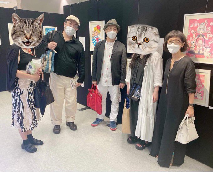 なんと本日初日、参加作家さん達がたくさん視察?!に行かれてたようです!😆 左から、 星崎真紀、きたがわ翔、阿部ゆたか、山田雨月、池沢理美、の各先生方💖 #漫画家とねこ展 twitter.com/hagiiwa/status…