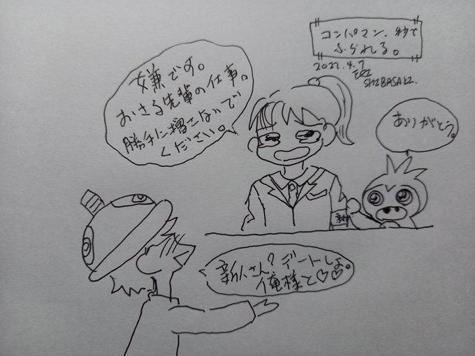 「コンパマンの悪事」 こっぺちゃんの事が大好きすぎるコンパマン。 こっぺちゃんの机の上に強力ローションをぶちまけて、逃亡中。 ベタベタの書類を見たおさるさん。驚く。 #コンパマン #ローション #おさるさん #こっぺちゃん #激務労働 #れぼこ #絵描きさんと繋がりたい #絵師さんと繋がりたい