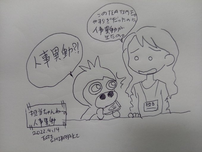 「担当ちゃんねーの人事異動」 おさるさんとのTEA TIMEをやすらぎにしていた担当ちゃんねー。 上司に呼ばれて、人事異動を言い渡される。 おさるさんとあうのは、休みの時しかないのをここで知る。 #おさるさん #激務労働 #担当ちゃんねー #人事異動 #絵描きさんと繋がりたい #絵師さんと繋がりたい