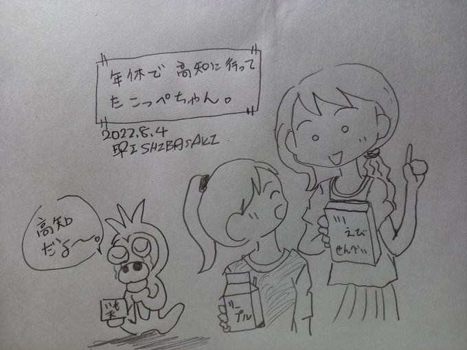 「年休で高知に行ってたこっぺちゃん。」 コンパマンからの誘いを断り、年休を取って高知に行ってたこっぺちゃん。 おさるさん。いも天に感動する。 #おさるさん #担当ちゃんねー #こっぺちゃん #激務労働 #年休 #高知 #絵描きさんと繋がりたい #絵師さんと繋がりたい