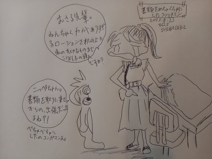 「書類をめちゃくちゃにしたコンパマン」 こっぺちゃんの机の上が、ローションまみれになっていて、やった主はコンパマン。 コンパマンは逃亡中。 おさるさんも驚く、滑り具合。 #おさるさん #こっぺちゃん #激務労働 #絵描きさんと繋がりたい #絵師さんと繋がりたい #ローション