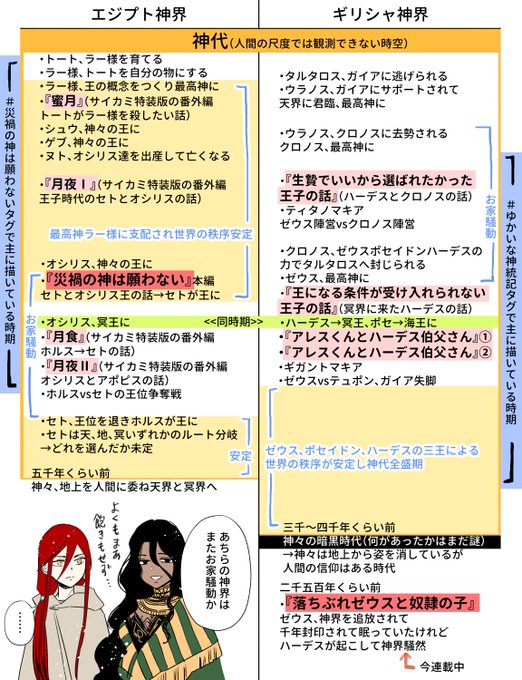 ゼウスとセトの共通点多いな〜と思って ・嵐を司る男神 ・自他共に認める強さ ・国の守護神もやってる ・冥王やってる兄がいる ・末弟 ・創世から数えて四代目 ・神々の王(一時的含む) ・頭から他神の子(?)を出産 ・周りから嫌われ気味 #災禍の神は願わない #落ちぶれゼウスと奴隷の子