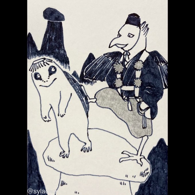 魔界遺産カッパドケヤ どけられる河童。 #ペン画 #絵 #猫 #河童 #天狗 #烏天狗 #inkdrawing #pendrawing #みんなで楽しむTwitter展覧会 *3/19,20 猫画個展@神保町*