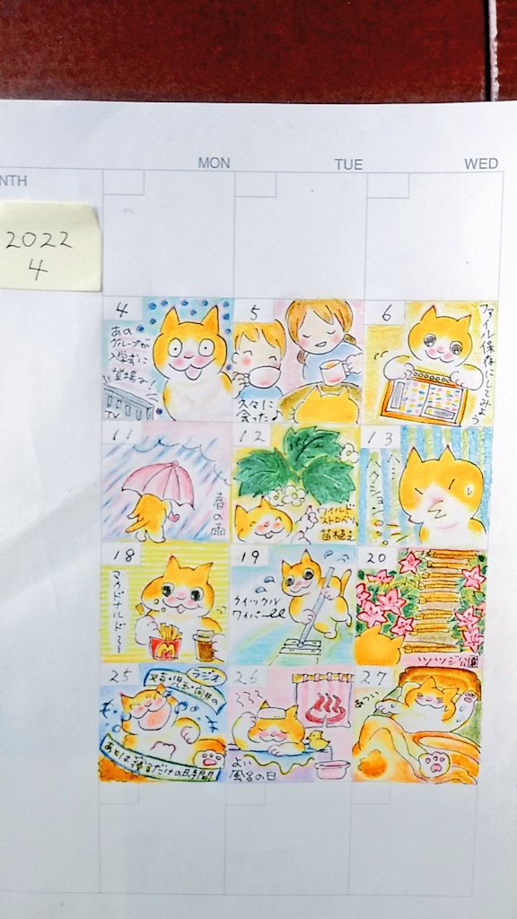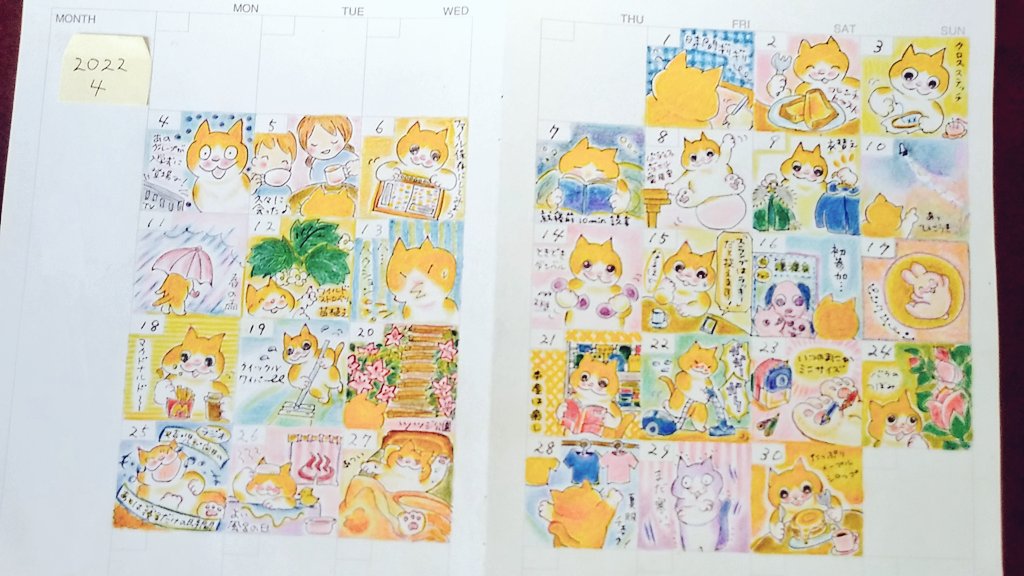 4月全体☺️ 2ヶ月目、なんとか描けました😊 小さいひとコマも描いてみると数時間…✏️ 5月はどんな出会いがあるかなー!🍀 #猫 #ねこ #cat #猫イラスト #イラスト好きな人と繋がりたい #illustration #無印良品 #無印ノートマンスリー #マンスリージャーナル #スケッチジャーナル #絵日記 #色鉛筆 #4月