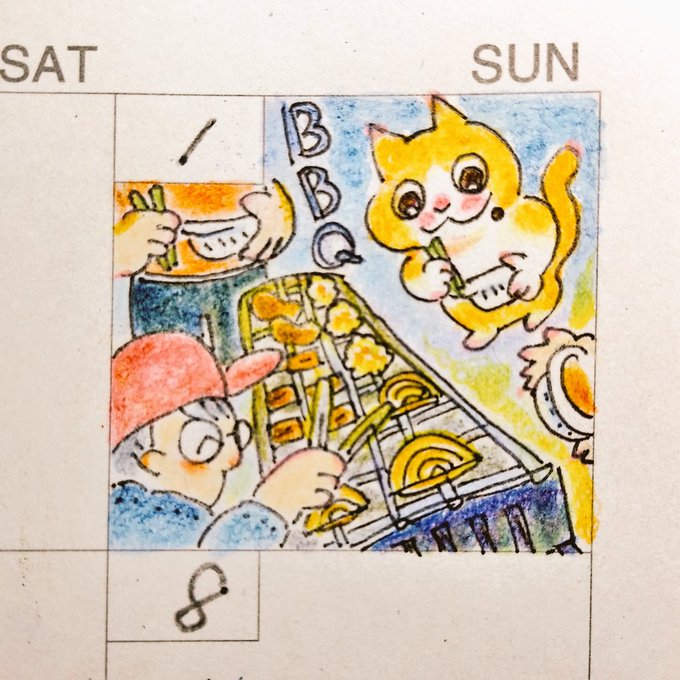 5月号始まりー! 5/1 久々のBBQ🎶 5/2 夏も近づく♪👏👏🍵 5/3 お釣りに旧千円札😲!一気におばあちゃんとの思い出がよみがえる…😊 #猫 #ねこ #cat #猫イラスト #イラスト好きな人と繋がりたい #illustration #無印ノートマンスリー #マンスリージャーナル #絵日記 #色鉛筆 #5月 #GW #BBQ #思い出