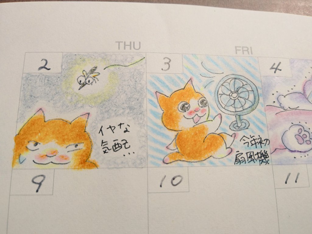 遅くなりましたが、6月号投稿しますっ。 6/1 #ワイルドストロベリー たまってきた! 6/2 蚊!! 6/3 扇風機の季節だ~ 6/4 季節の変わり目のお決まり…😂 6/5 📚️📕📖📗📙📘 #イラスト #イラスト好きな人と繋がりたい #illustration #無印ノートマンスリー #マンスリージャーナル #絵日記 #色鉛筆 #6月