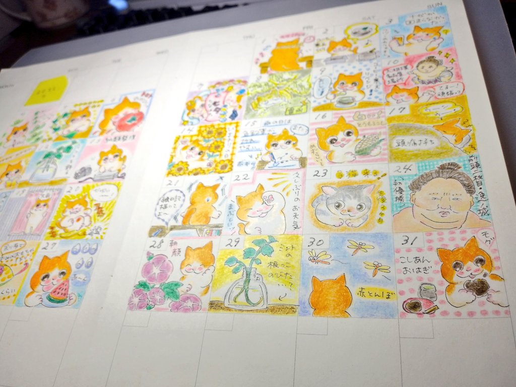 きょうは7月号。 …逸ノ城わかるかな?笑 インドア生活のなかに子猫も乱入! #絵日記 #イラスト #猫イラスト #イラスト好きな人と繋がりたい #illustration #無印ノートマンスリー #マンスリージャーナル #スケッチジャーナル #色鉛筆 #7月 #大相撲