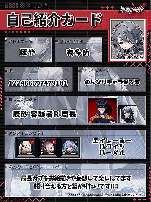 キャラも良ければストーリーも良くてどハマりしてます!よければお友達になってください〜¨̮✨ ⚠︎ コンビクトと局長が仲良く喧嘩してるのがすきなので イラストや妄想ツイ垂れ流します ⚠ #無期迷途 #無期迷途フレンド募集
