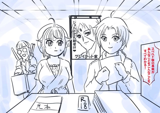 ワンドロテーマ、コミケと勘違いしていた【ザノバ】です…すいません… 後ろに嬉しそうなザノバさんがいます… コミケなわけないじゃん… ノルンたんはノリノリで描いた後に、我に帰って青ざめています…。一部くれ! #無職転生ワンドロワンライ