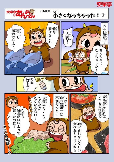 #安楽亭のあんらくん 34皿目 😱小さくなっちゃった!?💦 小さくなれたら、新世界が広がって楽しそうね🤩 でも、この場合はあんらくんにとって大問題💦 てか、もー子ちゃん、冷静すぎるー!😂 #焼肉 #あんらくん #安楽亭漫画 #漫画が読めるハッシュタグ 安楽亭HP📷anrakutei.jp