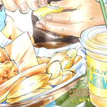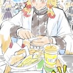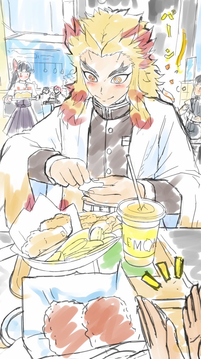 今日のお絵描き 続き すずめの戸締まりカフェの食事 あははは! 嘴平伊之助様だ🐗 権八郎がギョロギョロ目ん玉に飯を奢ってもらったらしい! アカウントの主、俺の誕生日忘れやがったな👹 #すずめの戸締まり #煉󠄁獄杏寿郎 #鬼滅の刃 #絵描きさんと繋がりたい #イラスト #嘴平伊之助生誕祭2023