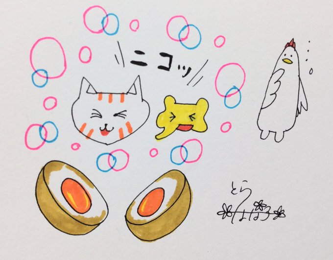 おはようございます!! #笑顔の日 #煮たまごの日 黄身の半熟具合が丁度良くてニコッ😁 卵では笑顔になれないニワちゃん💦 今日も素適な日曜日を〜🤗 #絵描きさんと繫がりたい #みんなで楽しむTwitter展覧会 #イラスト #油性ペン #マッキー画