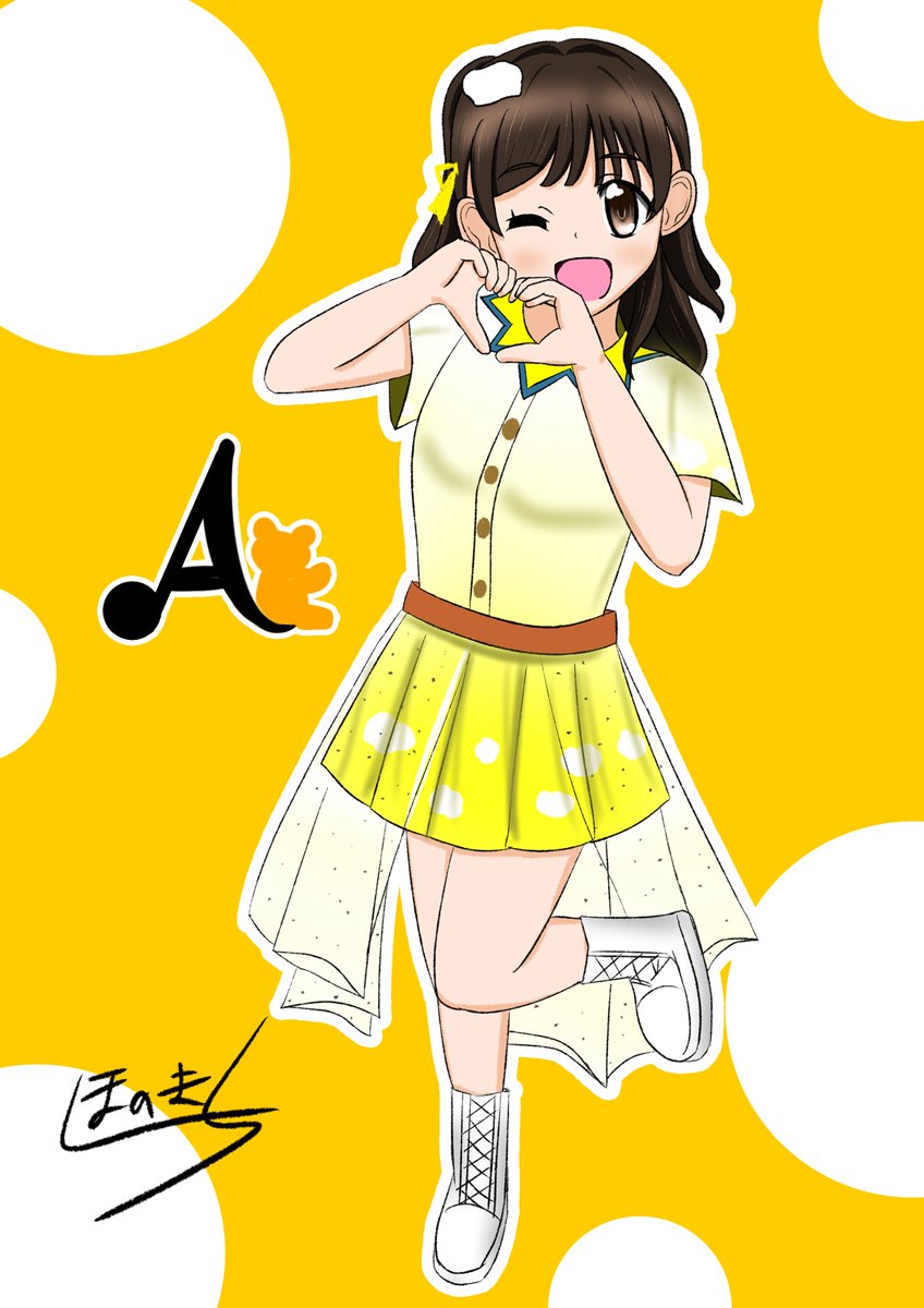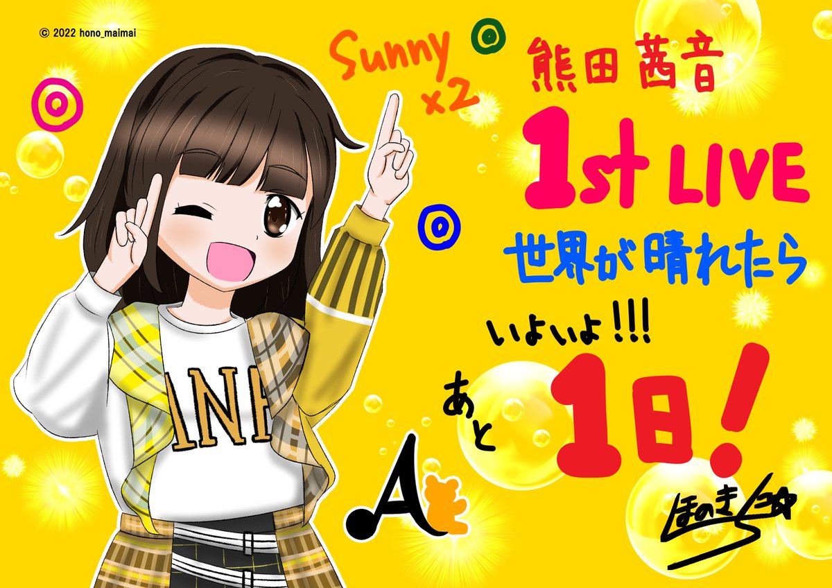 2022.6.11 投稿🧸 今回は、1stLIVE『世界が晴れたら』開催前に勝手にカウントダウンさせてもらっていた中から!🧸 明日初めてあかちゃんに会える!!というワクワクと大興奮の中で描き上げたのが懐かしいです😇 サニサニ衣装マジで好きなんです😍 #イラスト活 #熊田茜音 #熊田イラストアンコール