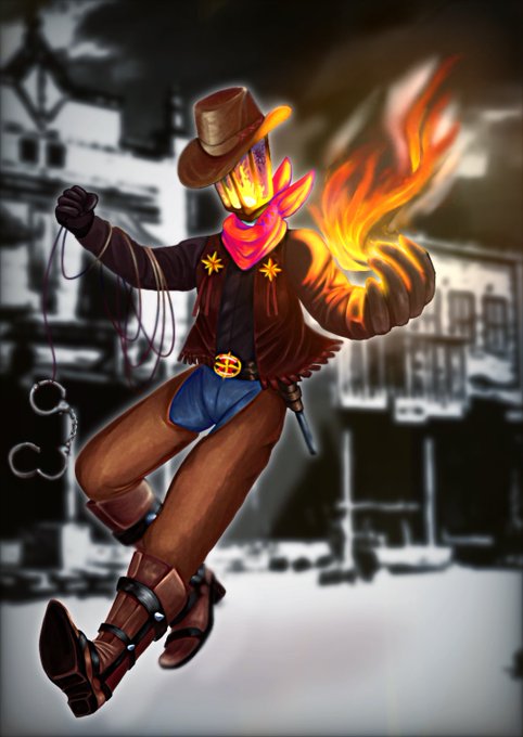 #熱血刑事とハロウィンしたい にて「賞金首専任捜査官 カウボーイ」のイグニスを描かせて頂きました! ちょっとネタが被るかなぁという気持ちはあったけど全く被ってなくてビックリ、ちなみに片手の炎で1時間近く泣いてました イグニス刑事の素敵な企画に参加させていただきありがとうございました!