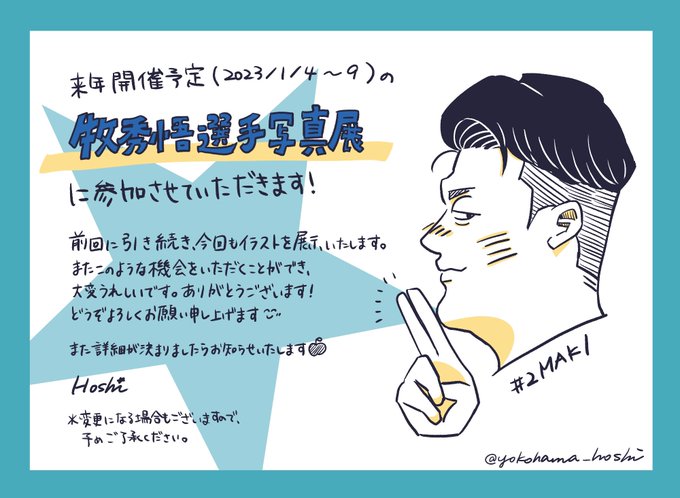 【お知らせ】 来年(2023年)1/4〜9に開催予定の牧秀悟選手写真展、前回に引き続きイラストで参加させていただきます🌟🌟 まだまだ絶賛準備中ですが、牧選手の魅力を少しでも多くの方へ伝えられるよう頑張ります! よろしくお願いします🍎 #baystars #牧が好きだと叫びたい #神奈川の牧 twitter.com/maki_shugo_spt…