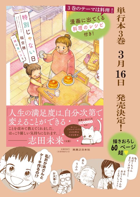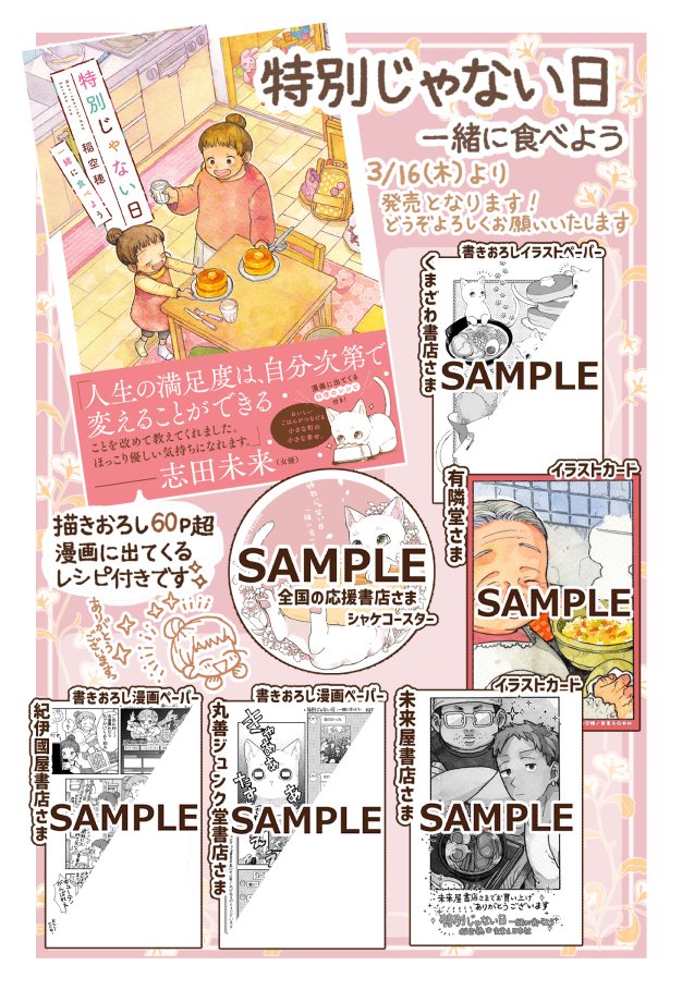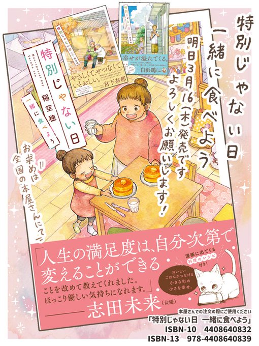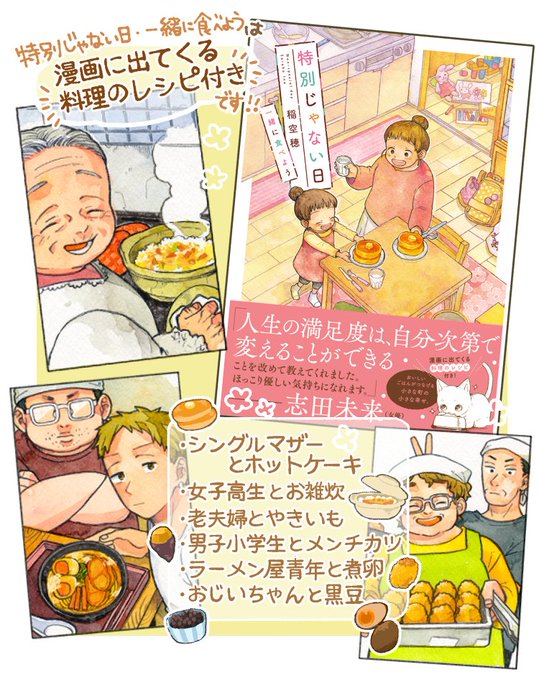 先月「特別じゃない日 一緒に食べよう」が発売となりました🙇♂️ 単行本では漫画に出てくる料理のレシピが掲載されています🥚✨ぜひチェックしていただけたら嬉しいです🍠🐱🥞 #特別じゃない日 「特別じゃない日 一緒に食べよう」書籍ページ■bit.ly/3ySnzS4