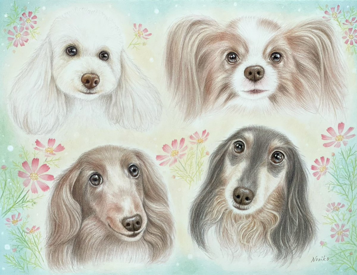 #色鉛筆画 #犬の似顔絵オーダー #ペットの絵オーダー #絵描きさんと繋がりたい メルファミリーさんの4人のワンちゃん達を描かせて頂きました🙏有り難い事に、Twitterからのオーダーも増えています🙏ご依頼は、プロフィールからInstagramへ飛んでDMからどうぞ♡︎ʾʾ