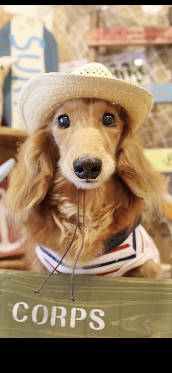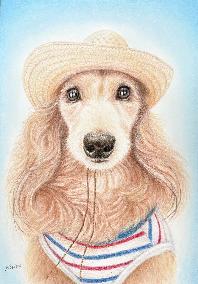 ミニチュアダックスフンドの、ベル君の色鉛筆画です。麦わら帽子が良く似合ってます♡︎ #みんなで楽しむTwitter展覧会 #春の創作クラスターフォロー祭り #色鉛筆画 #絵描きさんと繋がりたい #アナログ絵 #犬の似顔絵オーダー