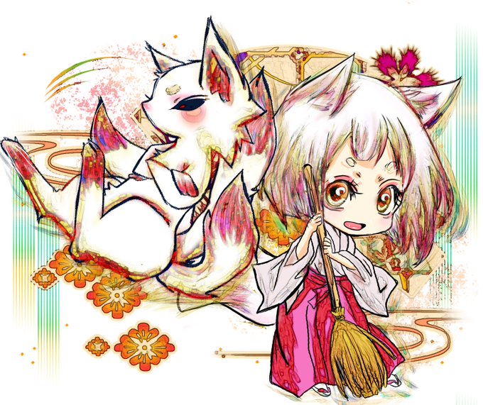 あまり描かないミニキャラを描いて5月を締めます🦊💖 ✨今月も沢山有難うございました☺️来月も良ければよろしくお願いします🙇♀️✨ 『お掃除手伝ってくださいよぉ』 『清めは下っ端の役目じゃ』 #イラスト #狐 #絵描きさんと繋がりたい