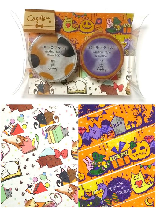 マスキングテープセット 🐱気ままなにゃんこいっぱい🐱 『ニャンコブック。』 黒猫さんとうさぎのぷにょんもパーティーに🐈⬛ᙏ̤̫͚🎃❤ 『パーティタイム。』 『猫まぁまぁうさぎとペンギン展』 #猫うさぎペンギン展 10/15-31 in大阪*中崎町(@hakomittsu.)様 #イラスト #マスキングテープ