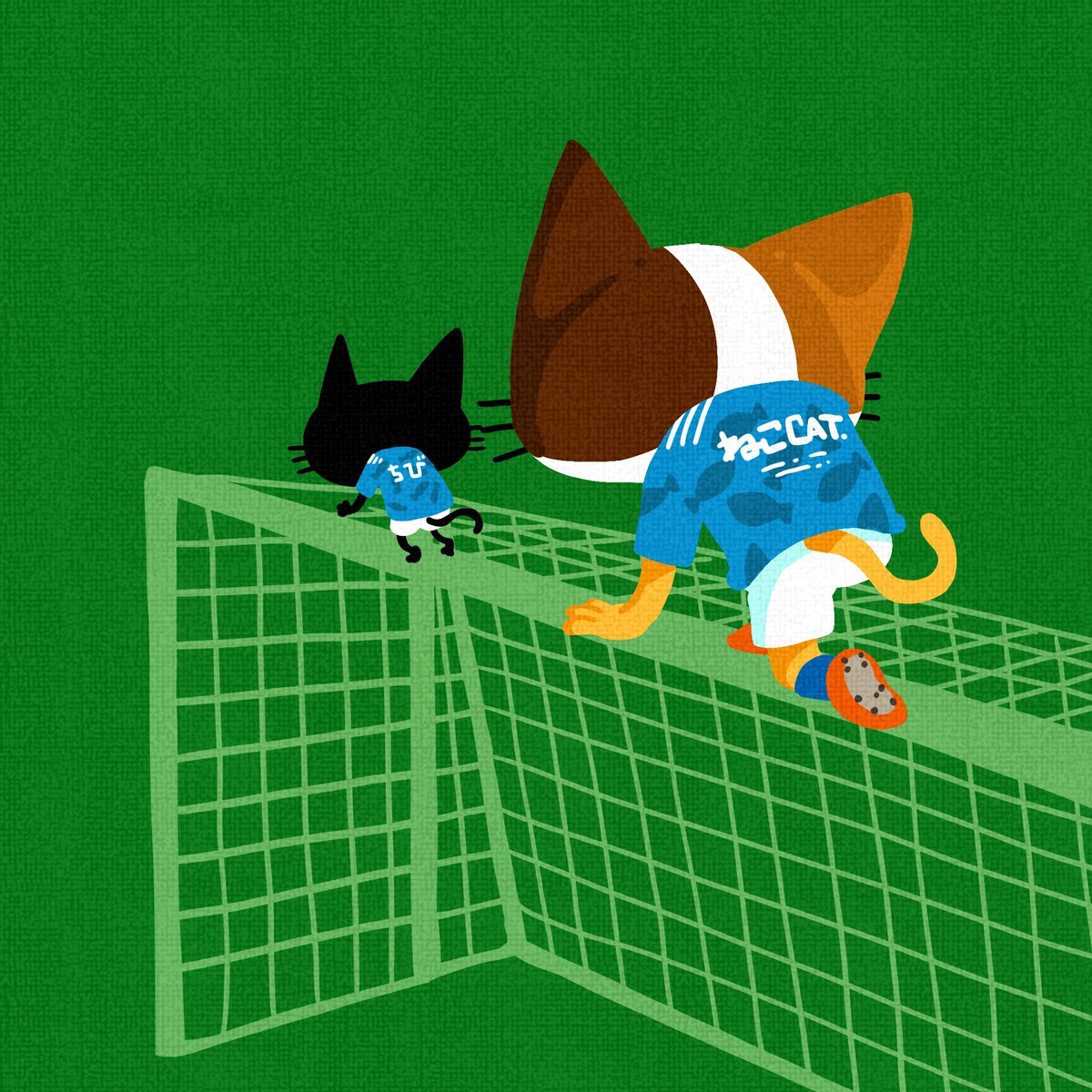 いよいよ明日はサッカーワールドカップ、日本代表の初戦。世界をあっと驚かせるサッカーをしてほしいですね。もちろんルールの範囲内で。 #ネコキャット #猫と仕事とサッカーと #worldcup #キャプテン翼 #イラスト #illustration