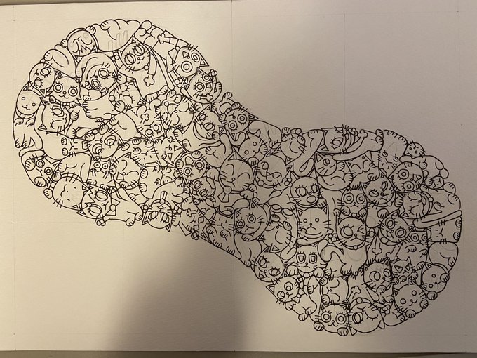 お前正気かと言う作品を描いています。白黒部分がようやく終わり、明日から猫の内部カラーを仕上げます。怒り任せに描いた作品です。俺史上最大の作品になります。 #絵描きさんと繋がりたい #イラスト好きさんと繋がりたい #猫のパズル