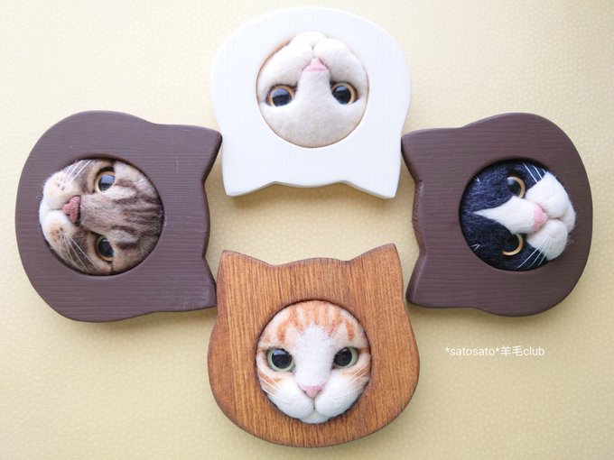 昨日の #猫型丸フレーム の子たち🐱🐱🐱🐱 1日3つ店頭に出したいのであと2匹! 現在の被り物?は暫定です😁 #羊毛フェルト #猫フレーム #猫好きさんと繋がりたい #猫の居る暮らし #名古屋 #クリマ #クリエイターズマーケット