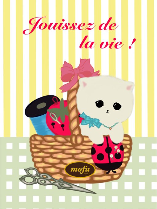ソーイングセットに入り込んでほっこり。。。 フランス語で、 「人生を楽しもう!」という文字を入れました༚˚✧₊⁎ ☆*.⁎⁺˳✧༚。 #猫好きさんとつながりたい #ねこ #イラスト好きさんとつながりたい #イラスト