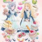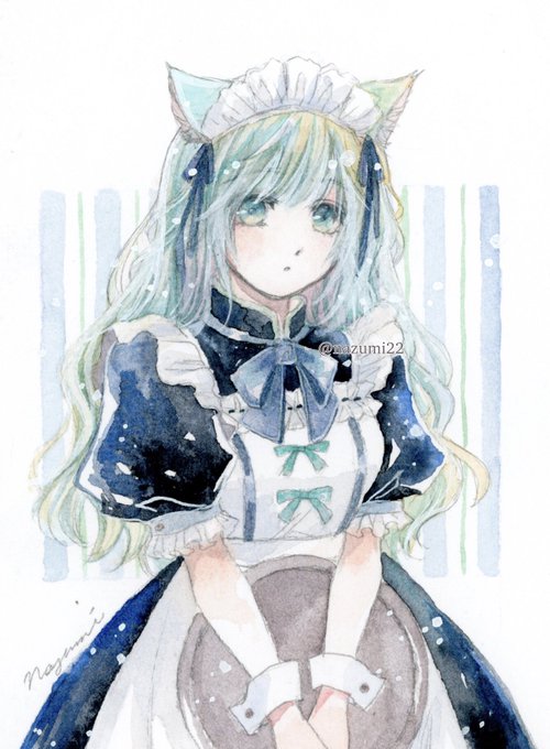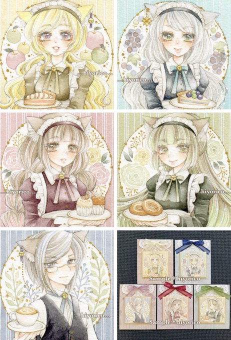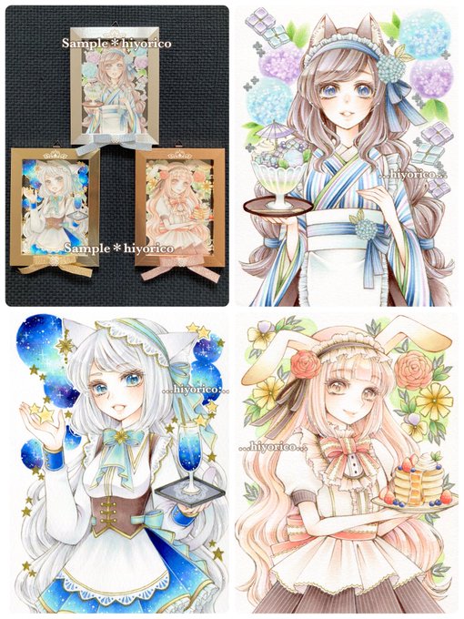 右上🦊【紫陽花亭 -紫乃-】 左下🐱【夜猫カフェ -ヨル-】 右下🐰【Cafe Moca -モカ-】 それぞれ別の喫茶店の店員さんです 左上に額装ver.も載せています✨ 今回は透明フレームに入れるべく切り抜き頑張りました…!✂️✨💦 #獣耳カフェの甘い誘惑 #コピック