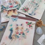 #獣耳カフェの甘い誘惑 追納作品の豆色紙イラストです✨ ウチの🐱達を勢揃いさせました! 小鈴・ヨル 桜子・緑子 鈴太郎・ラッピング写真🎀 絵墨初挑戦でしたがすごく良いお色だし表現の幅無限大…!で、これからたくさんつかわせて頂きたいですー!🖌✨