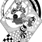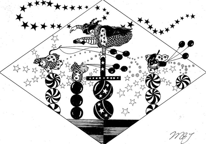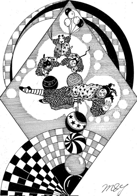 🎪🃏😸😺🐶ボールの上でアクロバットダンスをする《道化師と陽気な仲間たち》⚽🥎🏀🏐 #道化師と陽気な仲間たち #アトリエの系譜N #マンガスタイルイラスト #アナログ #モノクローム #ペン画 #玉乗り #アクロバット #ダンス #白黒猫 #ワイヤーフォックステリア