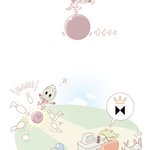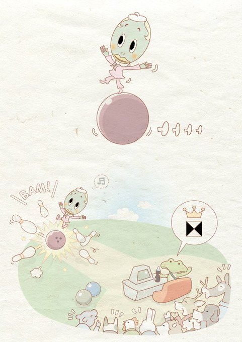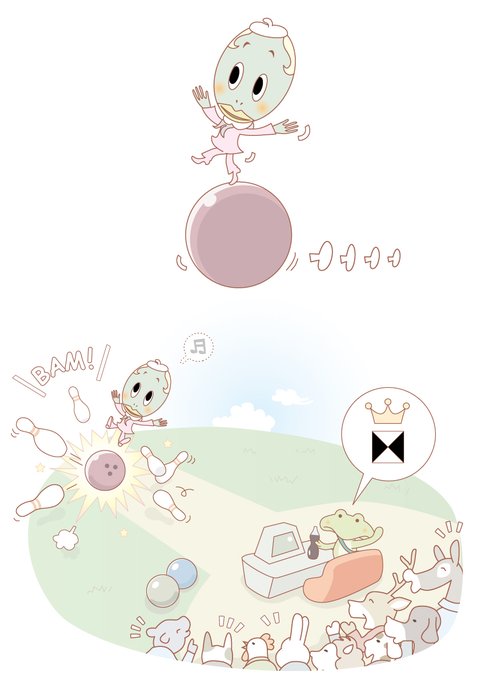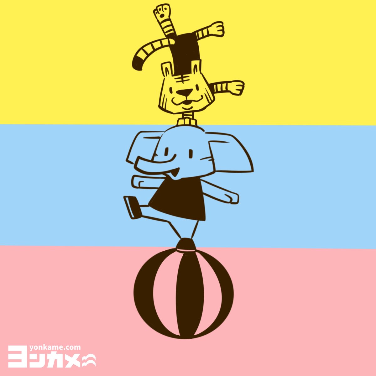 💞😺😸🐶「積み上げられたボールの上を次々とジャンプで移動していくという、僕達にとっては難易度の高いアクロバットやってます!」(by《道化師と陽気な仲間たち》🎪🃏😺😸🐶) #道化師と陽気な仲間たち #アトリエの系譜S #マンガスタイルイラスト #ペン画 #アナログ #アクロバット #玉乗り