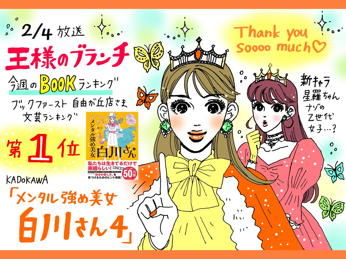 #王様のブランチ 今週のBOOKランキング なんと第1位🥇🙇♀️🎉 『メンタル強め美女白川さん』4巻 お手に取ってくださった方、昔からご愛読くださっている方、最近出会ってくださった方、お一人お一人に心から御礼申し上げます。 (リプ欄1~4巻大量試し読みご案内!!📚) twitter.com/sisi0ccc/statu…