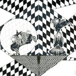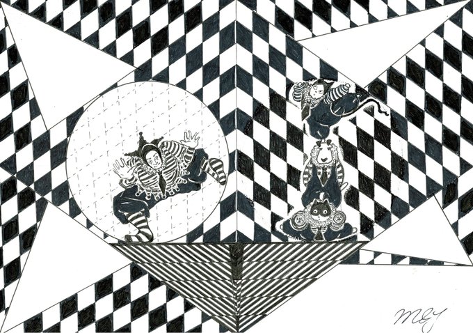 🔵「球体の中」🔵 《道化師と陽気な仲間たち》によるパントマイム🎪🃏😸😺🐶 #道化師と陽気な仲間たち #オリジナルキャラクター #アトリエの系譜S #アナログ #モノクローム #ペン画 #パントマイム #道化師 #猫 #犬 #picturebookillustration #球体 #パフォーマンス