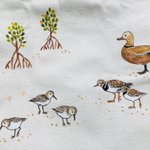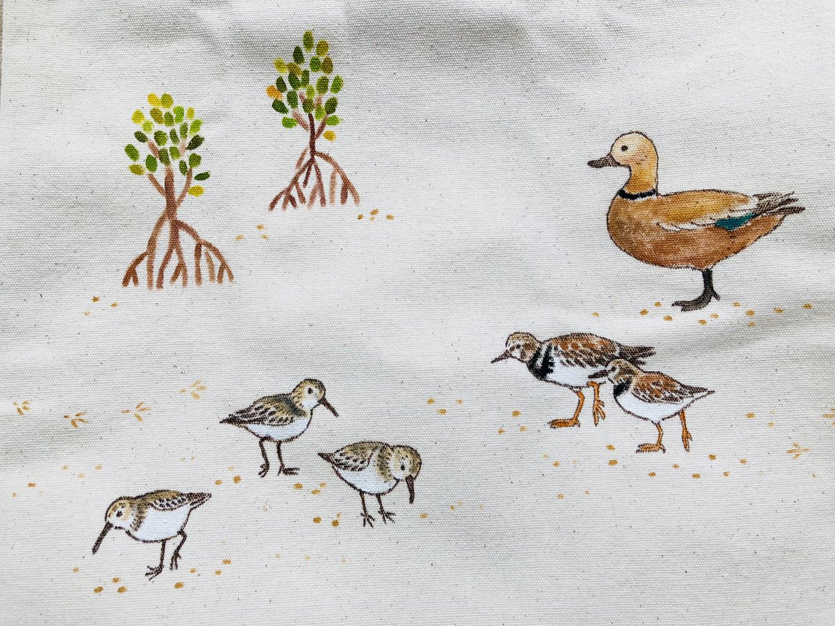 #琉球いきものづくし こんなものも描いてみました 名蔵アンパルに行った時に見られた鳥たち(ハマシギ、キョウジョシギ、アカツクシガモ) 特にシギやチドリのなかまが、地面をつんつんやってて、とても可愛かった 手描きのトートバッグです