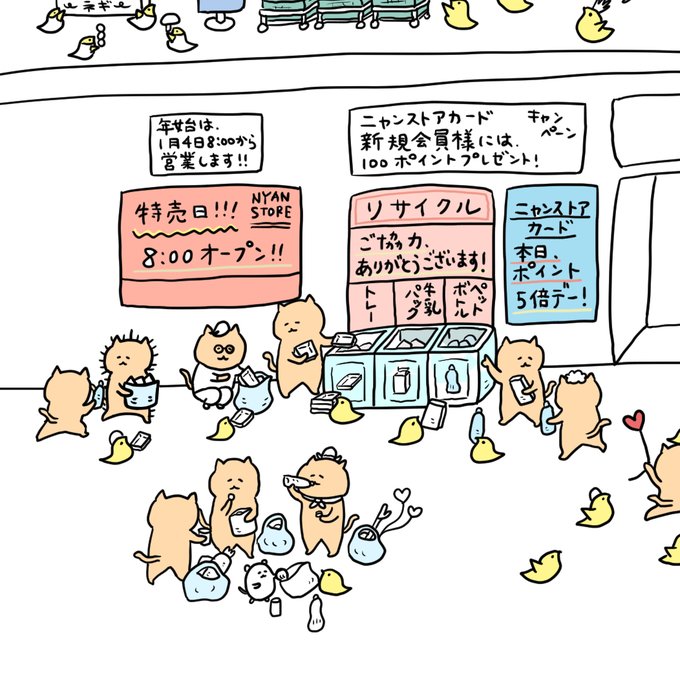猫のスーパー「ニャンストア」の途中経過です👍 リサイクルコーナーです✨ #イラスト #イラスト好きな人と繋がりたい #絵描きさんと繋がりたい #ゆるい絵 #猫好きさんと繋がりたい #猫のいる暮らし #digitalart #digitalartists #artistsontwitter #スーパー #グルメ #環境 #エコ #リサイクル