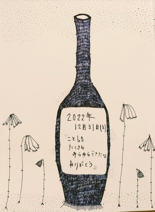 2022年よありがとう 2023年も たくさん 線 音 酒 まみれられますように みなさん よいおとしを〜 #絵 #イラスト #線画 #ペン画 #花 #瓶 #文字がはいると小学生 #お餅はちゃんと小さくかんでや〜