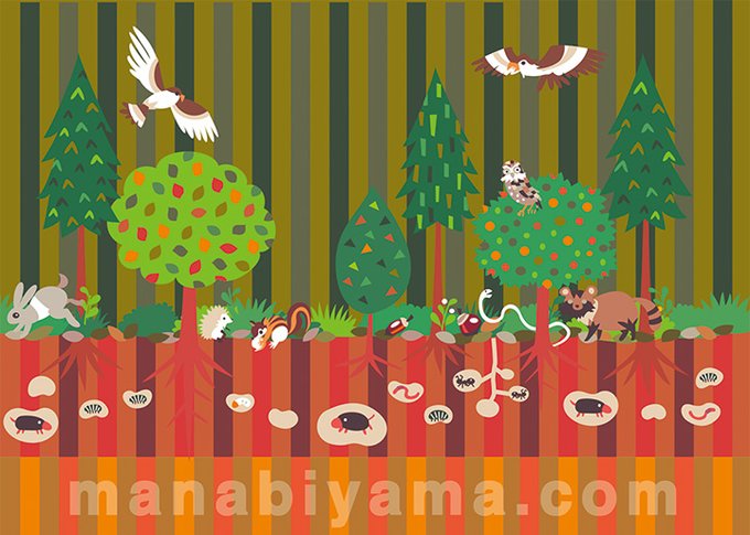 イラスト:森のいきものたち 上から下から食べものをさがす。 作品を #イラストレーターズ通信 webで更新しました。 illustrators.jp/profile.php?id… #生き物 #動物 #森の暮らし #アースカラー #環境 #生態系 #ストライプ #イラスト #イラストレーター #manabiyama #130we