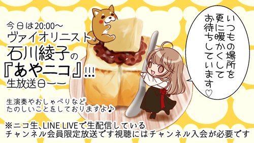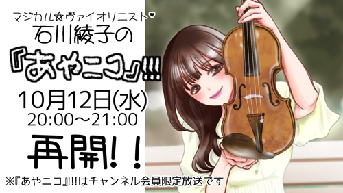 ヴァイオリニスト 石川綾子 の『あやニコ』!!! 10月12日(水)20:00~21:00 本日再開(๑✪ㅁ✪๑)✧ 詳しくは↓スタッフさんのツイート twitter.com/staff_ayako/st… ※ch会員限定放送 ayako-ishikawa.com/news/2020/08/p… #生演奏 #ファンアート #イラスト #推し活
