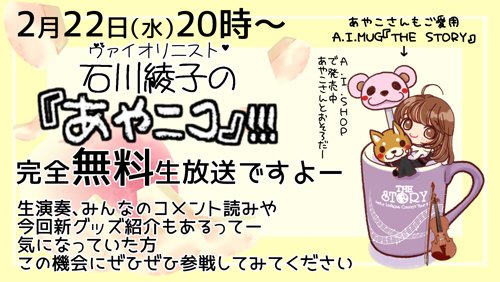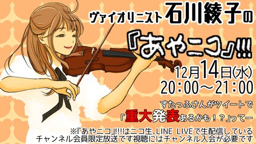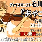 ヴァイオリニスト 石川綾子 の『あやニコ』!!! 12月14日(水)20:00~21:00 ♪ニコ生 live.nicovideo.jp/watch/lv339421… ♪LINE LIVE live.line.me/channels/671/u… ※ch会員限定放送 ayako-ishikawa.com/news/2020/08/p… #生演奏 #ファンアート #イラスト #推し活