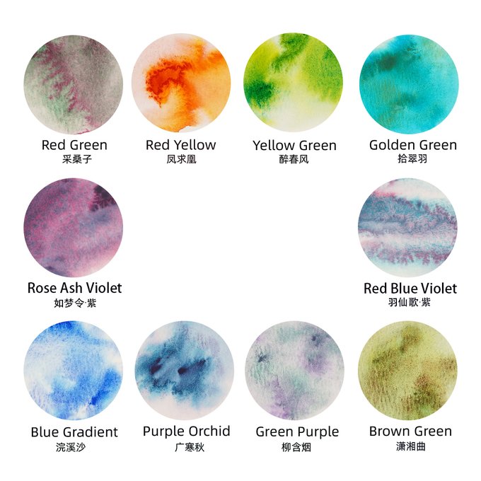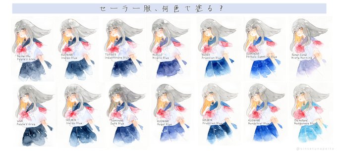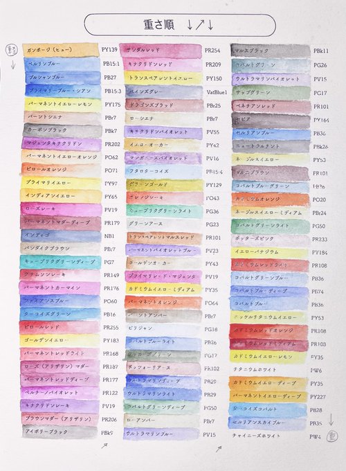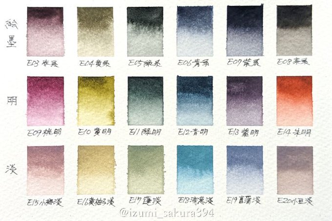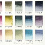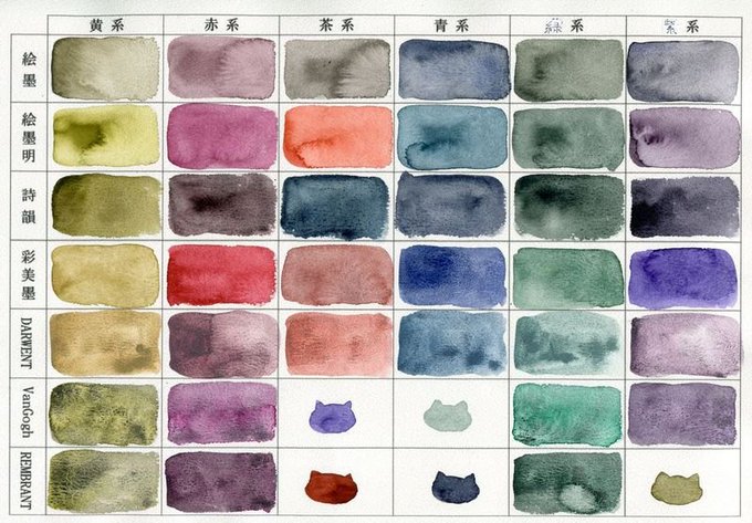 クサカベさんのハルモニア×通常色混色の可能性、無限大♾すぎでは…?😳😳😳 ※混色見本は初代ハルモニア(01〜10)によるものです #画材研究タグ #watercolor twitter.com/mio_n_draw/sta…