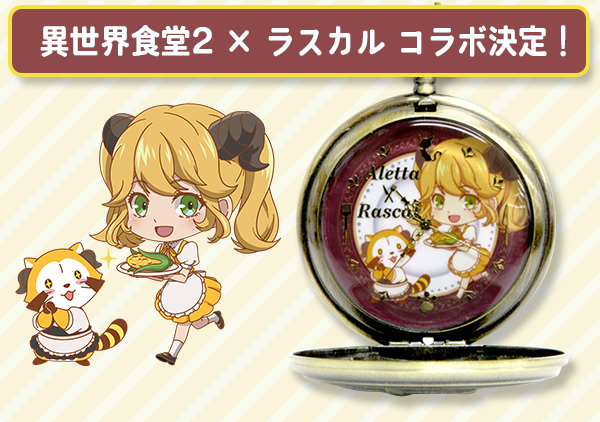 📢TVアニメ「異世界食堂2」とコラボ✨ 店主、アレッタ、クロ、サラ、ヒルダのミニキャラとのかわいらしいコラボイラストに注目してミャ🎵 コラボ懐中時計も発売するよ!(◆'∀'◆) araiguma-rascal.com/news_event/202… #ラスカル #異世界食堂2